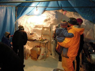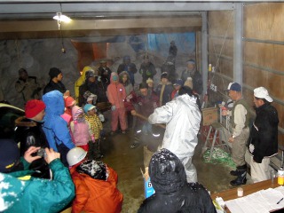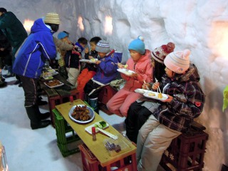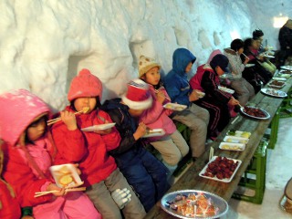 子供たちがほんやらどうの中でお餅をいただく