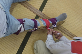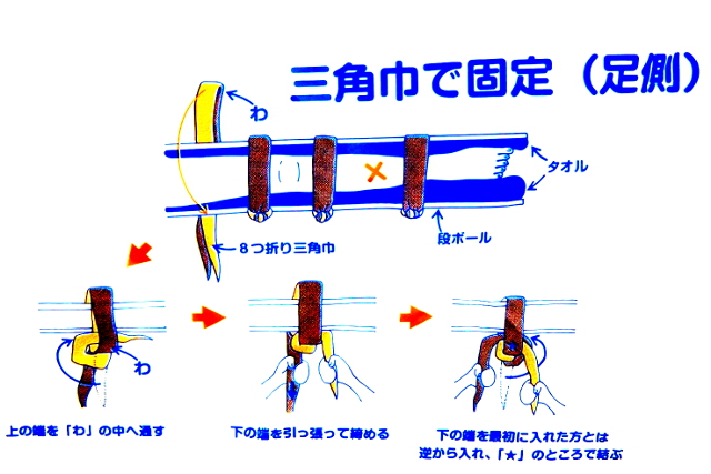 「風呂敷を使った三角巾で固定(足側)」