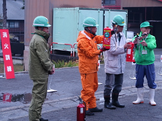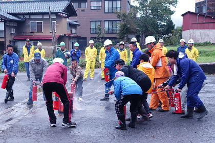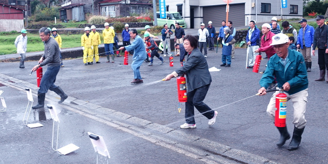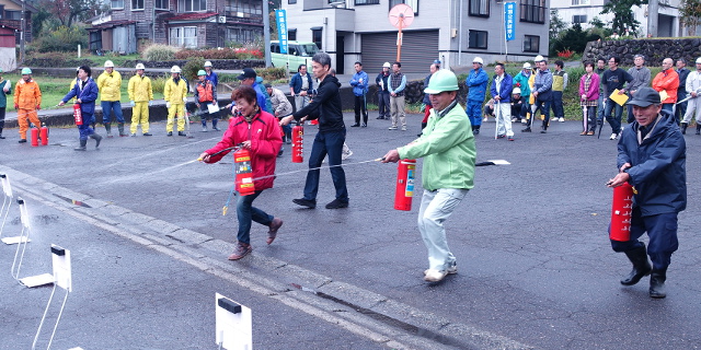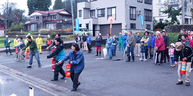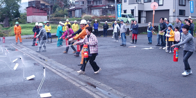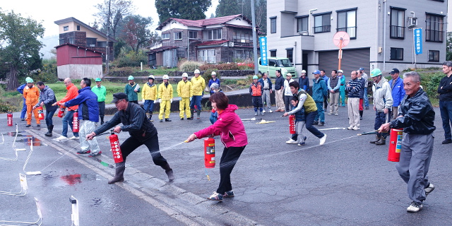 10月11日(日)に防災訓練が行われました。 今年は避難訓練の後、コミュニティーセンターにて「NPO法人セーフティーネットぼうさい」及び「消防団」による消火訓練と水防訓練を行いました。